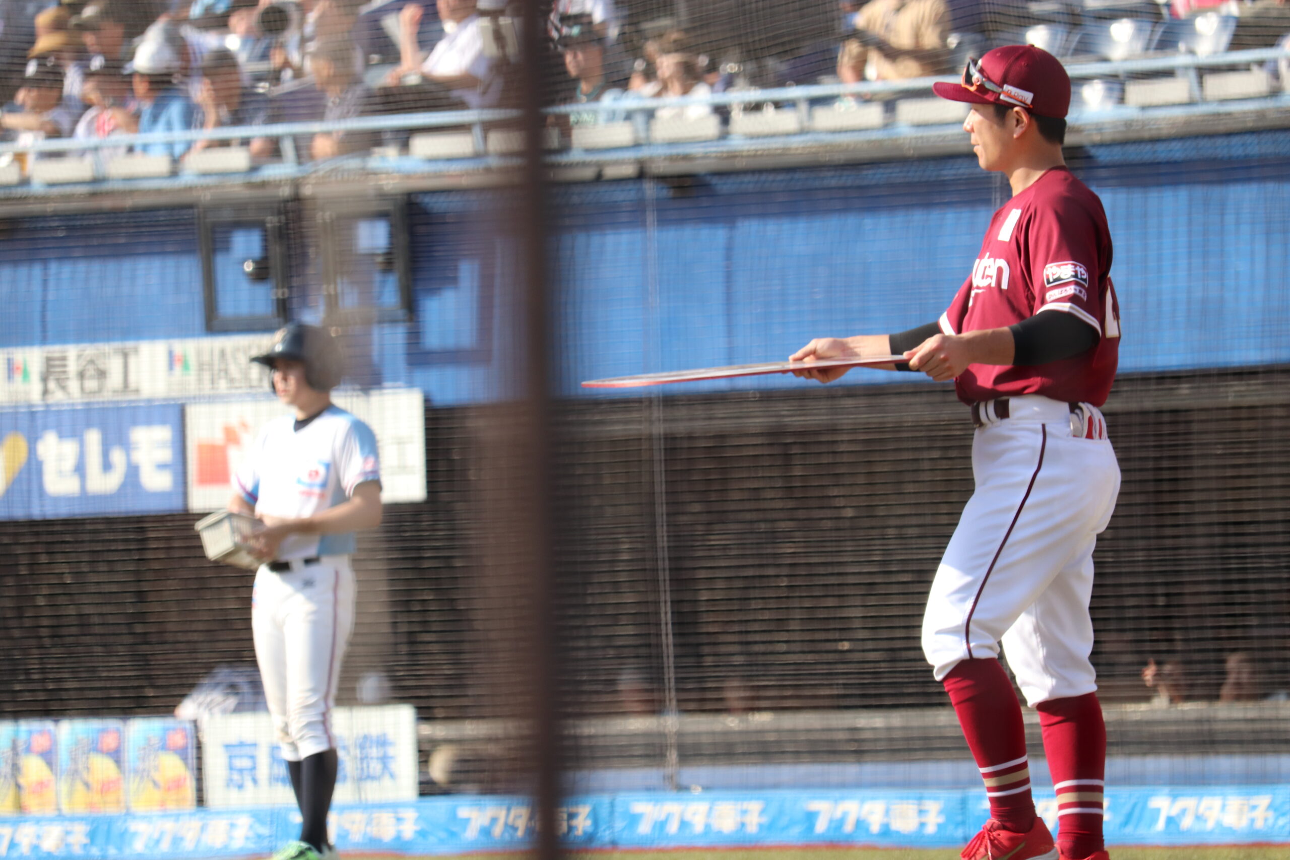 鈴木大地選手は岡島豪郎選手からボードを受け取ると、三塁へ掲げ、その後に一塁方向へボードを掲げました。